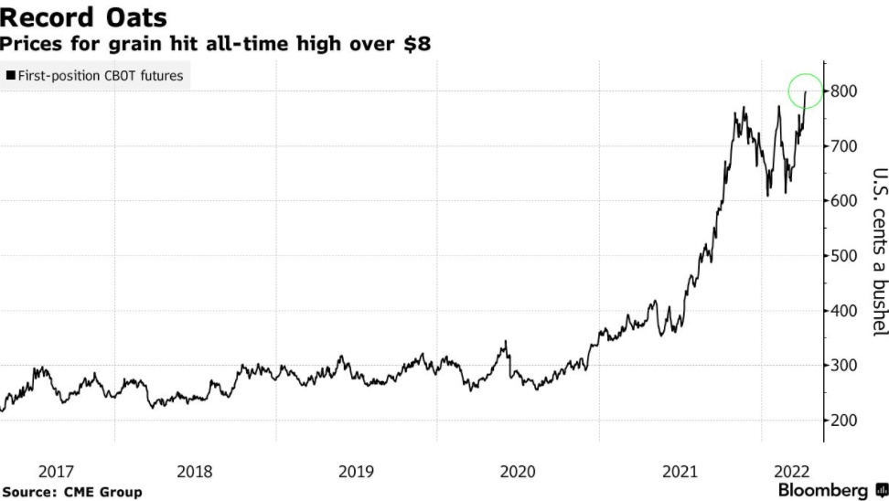 智通财经APP获悉,由于加拿大大草原地区天气持续干燥,主要谷物燕麦的价格周一跃升至历史新高。芝加哥燕麦期货上涨1.6%,至创纪录的每蒲式耳8.075美元。