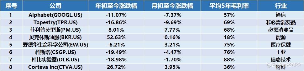 在高盛青睐的拥有强定价权的8家公司中,有5家年初至今股价下跌,其中,科斯塔(CSGP.US)、杜比实验室(DLB.US)、Tapestry(TPR.US)跌幅都超过16%,而科技巨头Alphabet(GOOGL.US)跌超11%。
