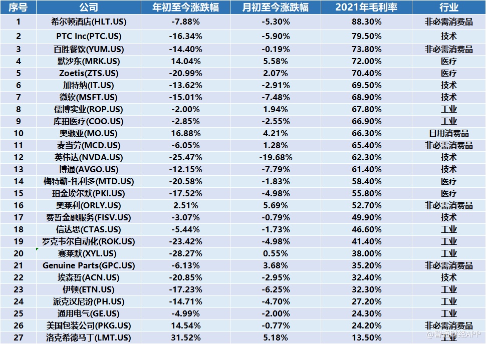 而在巴伦周刊筛选出的拥有定价权的27家公司中,仅有5家公司年初至今股价上涨,包括洛克希德马丁(LMT.US)、奥驰亚(MO.US)、美国包装公司(PKG.US)、默沙东(MRK.US)、奥莱利(ORLY.US)。而且,在22家年初至今股价下跌的公司中,有14家公司的跌幅在12%以上,其中,跌幅超过23%的个股有罗克韦尔自动化(ROK.US)、英伟达(NVDA.US)和赛莱默(XYL.US)。