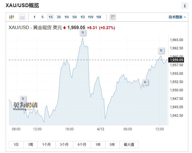 智通财经APP获悉,在美国将于今晚公布3月CPI数据之前,投资者对通胀的担忧以及避险情绪提振了对黄金的需求,金价连续第五个交易日上涨。截至发稿,黄金现货涨0.27%,报1959.05美元/盎司,并一度向上触及1960美元。