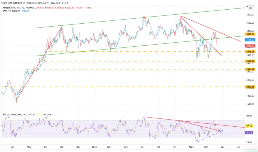 目前,亚马逊的技术面非常疲软,从疫情低点开始的看跌信号正在上升。自2022年初亚马逊股价跌破其交易渠道(Trading Channel)以来,该股一直在走低,似乎即将跌至2890美元。不过,该股不太可能止跌于2890美元,而更有可能在3月初重回2650美元左右的低点。