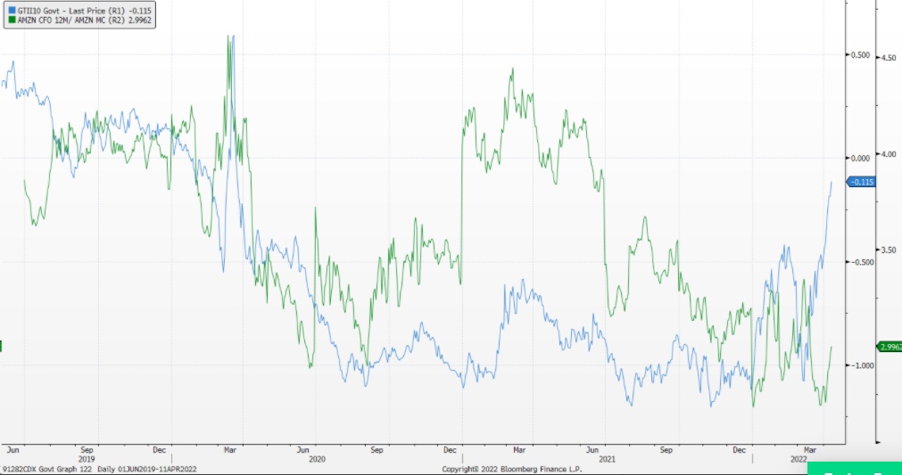 因此,实际收益率是极有可能飙升的,这也意味着通胀债券指数ETF将继续下跌,同时亚马逊股价也将进一步下跌,而亚马逊股价下跌的速度可能取决于该公司管理自由现金流的效率。