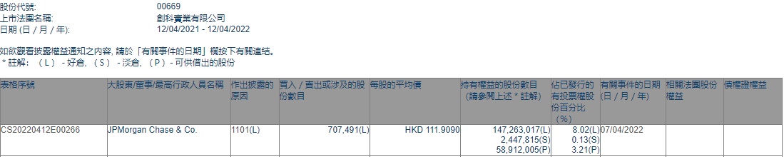 智通财经APP获悉,香港联交所最新资料显示,4月7日,小摩增持科创实业(00669)70.7491万股,每股作价111.909港元,总金额约为7917.46万港元。增持后最新持股数目约为1.47亿股,最新持股比例为8.02%。