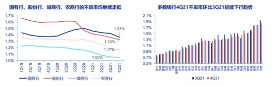 细分来看,大部分的银行均有不同程度改善,2021年末国有行、股份行不良率分别为1.36%、1.25%,季环比分别下降6bp、4bp。上市银行中,邮储、招行、宁波、杭州、厦门、常熟等银行不良率持续处在1%以下。此外,工行、建行、以及江阴等银行不良率明显下降,环比降幅均超过10bps。