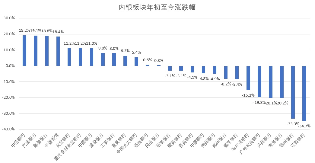 对港股市场来说,内银股的估值相对于A股来说一直处在并不太活跃的“洼地”,同时随恒指波动。尽管板块内仍然呈现出较多银行下跌的境况,但也存在一些结构性机会,年初至今,涨幅最大的是银行为中信银行(00998)、交通银行(03328)、邮储银行(01658),可见稳健的国有行或股份制银行颇受青睐,而城农商行却没有这般好运,江西银行(01916)、锦州银行(00416)和青岛银行(03866)位列跌幅前三,分别跌34.7%、33.3%、20.22%。