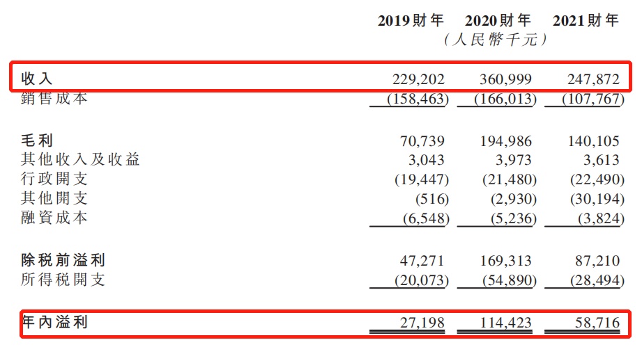 据招股书数据显示,2019财年至2021财年,该公司实现收入分别为2.292亿元、3.61亿元及2.479亿元,实现净利润为2720万元、1.144亿元及5870万元,整体而言,这两大核心财务数据皆表现较为波动。