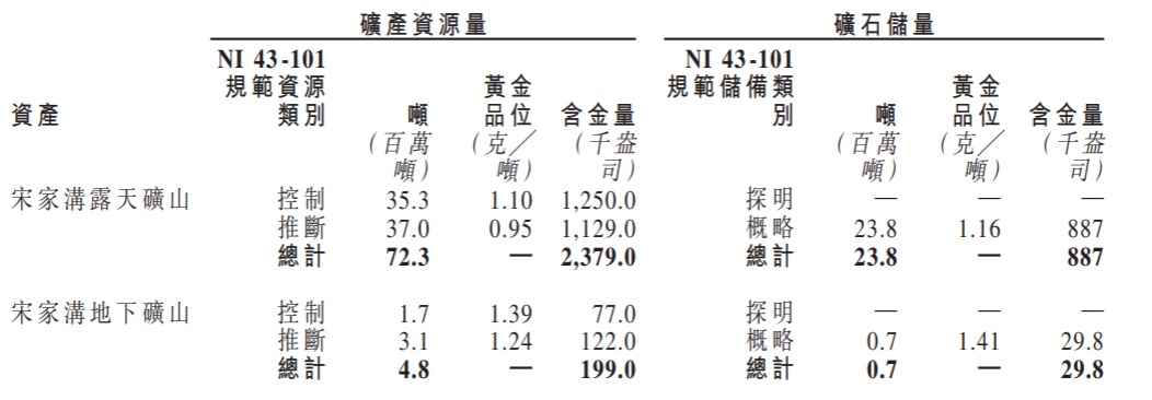 具体而言,该公司目前拥有2座矿山资产及相关基础设施,包括:1项年许可矿石产量为90万吨的露天黄金矿,即宋家沟露天矿山;1项年许可矿石产量为9万吨的地下黄金矿,即宋家沟地下矿山;1个年处理矿石能为约为200万吨的选矿厂;1座总存储容量约为42.2百万立方米的尾矿库。此外,该公司手下的2项矿山的采矿许可证,到期时间均为2031年。