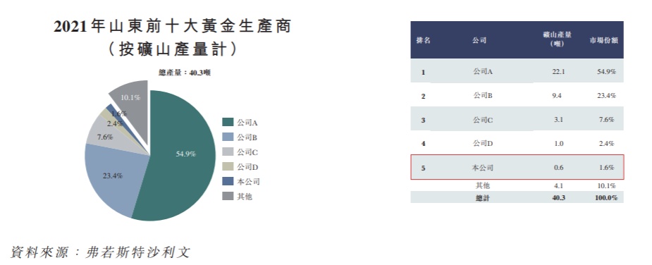 据招股书数据披露,2021年,山东省约有30家从事黄金开采的黄金生产商,总体金矿产量达到约40.3吨。按金矿产量计算的前五大黄金生产商占山东省金矿总产量的约89.9%。其余黄金开采生产商占据约10.1%的市场份额,各生产商的平均金矿产量约为每年0.16吨。