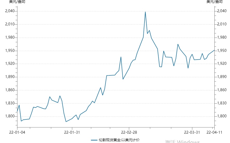 而需要指出的是,在当前通胀压力+俄乌冲突的刺激之下,黄金价格上涨之势则更为明显。截至4月11日,伦敦现货黄金已经突破1950美元/盎司“大关”。