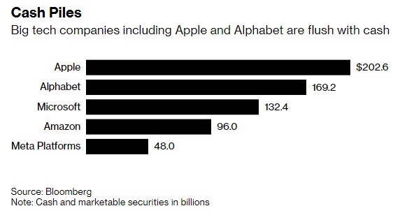 随着现金的快速充盈,Alphabet(GOOG.US)和微软(MSFT.US)等公司一直在寻找利用多余现金的途径。苹果此前的回购总额为2745亿美元,其中仅在去年12月当季就有204亿美元的回购。然而,苹果的资产负债表上仍有超过 2000 亿美元的现金,并且获得了购买高达 3150 亿美元股票的授权,因此还可以进行更多的回购。