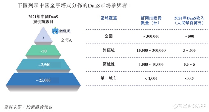 根据灼识咨询报告显示,整体而言,我国DaaS提供商目前大体可分为四个梯队。其中,第四梯队规模最大,包括约25000家小规模的区域性DaaS提供商,仅在某一城市提供服务,供订阅的设备不到1000台;第一梯队公司收入则超过人民币5亿元,供订阅设备超过300000台,当前仅有两家公司。