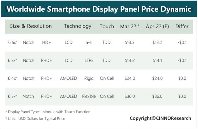 CINNO Research预估2022年4月和5月AMOLED面板价格大概率将继续维持高位;受终端需求疲软影响,a-Si/LTPS面板价格仍将下行。