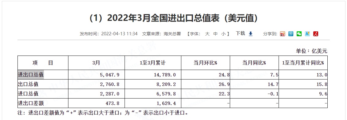 智通财经APP获悉,4月13日,海关总署公布2022年3月全国进出口总值(美元值)。3月进出口总值为5047.9亿美元,同比增长7.5%;其中,出口总值2760.8亿美元,同比增长14.7%;进口总值2287亿美元,同比下降0.1%;进出口差额为473.8亿美元。