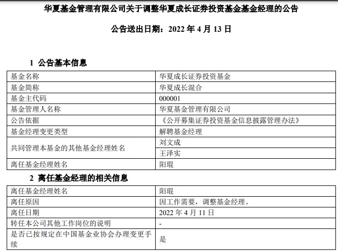 智通财经APP获悉,4月13日,华夏基金发布公告称,阳琨因工作需要,不再担任华夏成长混合(000001.OF)基金经理,离任日期为4月11日。基金经理调整之后,华夏成长混合由刘文成、王泽实共同管理。阳琨已在华夏基金任职14年,现任华夏基金副总经理、投资总监,他当前基金资产总规模为258.75亿元,任职期间最佳基金回报达230.30%。
