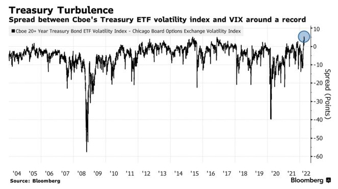 另外,在瑞银股票衍生品研究主管Stuart Kaiser看来,投资者还需关注CBOE 20年以上国债ETF波动率指数(VXTLT)和VIX指数之间的差值。目前,VXTLT和VIX指数之间的差值为正,并且还在不断上升。