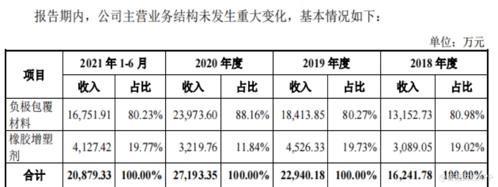 公司主要产品是负极包覆材料,副产品是橡胶增塑剂。其中,负极包覆材料是一种具备特殊性能的沥青材料,一方面可以作为包覆剂和粘结剂用于锂电池负极材料的生产加工,改善负极材料的产品性能;另一方面可通过专有工艺制成碳纤维可纺沥青,经过纺丝、碳化等生产工艺处理后,得到沥青基碳纤维产品。过往业绩期间,信德新材的负极包覆材料销售占比维持在80%以上。
