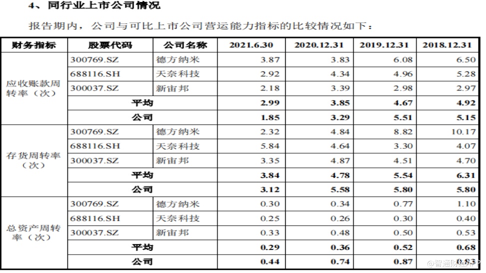 据信德新材与德方纳米、天奈科技、新宙邦等可比上市公司营运能力指标比较数据。公司2021年上半年的应收账款周转率为1.85次,远低于可比上市公司平均2.99次的水平。