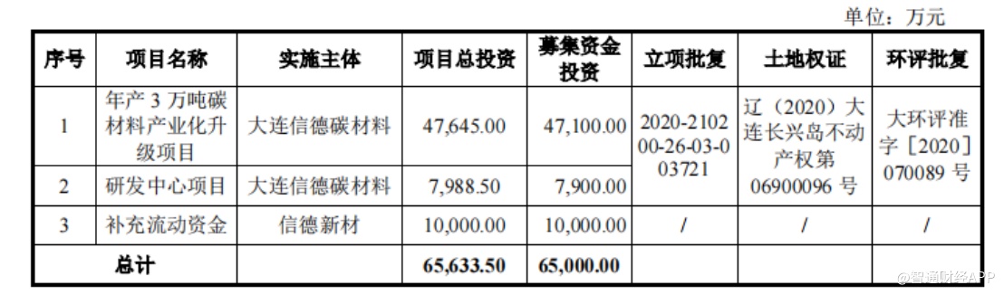 招股书显示,信德新材本次上市拟公开发行新股不超过1,700万股,募集资金6.5亿元,其中4.71亿元将用于年产3万吨碳材料产业化升级项目。公司计划依托部分现有生产管理和辅助设施,新建生产线,项目建成后能够实现年产锂电池负极包覆材料23,323吨,碳纤维可纺沥青6,677吨的能力。