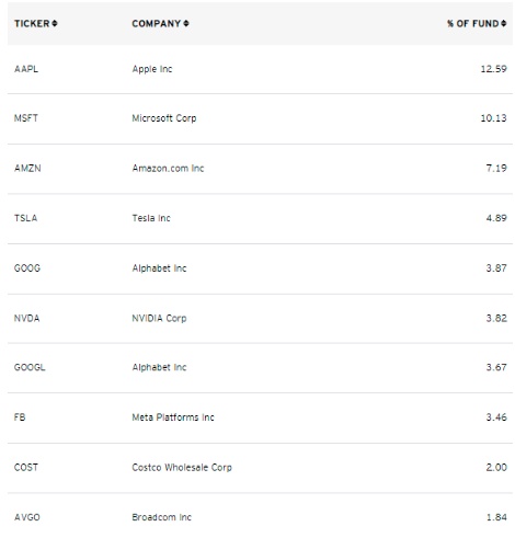 如上图所示,苹果(AAPL.US)、微软(MSFT.US)、亚马逊(AMZN.US)、特斯拉(TSLA.US)和Alphabet(GOOG.US)位居景顺QQQ ETF持仓前十。如果把Alphabet的两类股票合并起来,百事可乐(PEP.US)也能跻身前十。