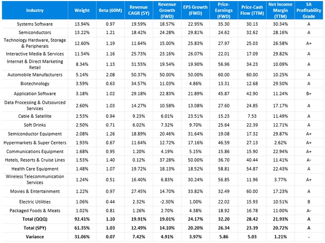 下表总结了景顺QQQ ETF前20个行业的关键基本指标。以这种方式概述所有ETF,是为了缩小对基金十大持仓的狭隘分析与过于宽泛的行业分析之间的差距。