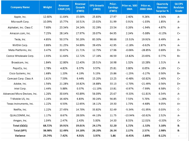 这些数据表明,景顺QQQ ETF持仓公司上季度的收益与SPDR 标普500信托 ETF类似,从相同的每股收益修正分数(EPS Revisions Scores)可以看出,分析师们并不偏爱景顺QQQ ETF。真正的问题是估值,所以投资者应该仔细看看景顺QQQ ETF增持的四家公司业绩预期: