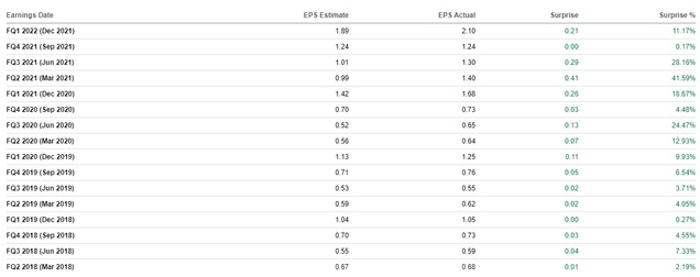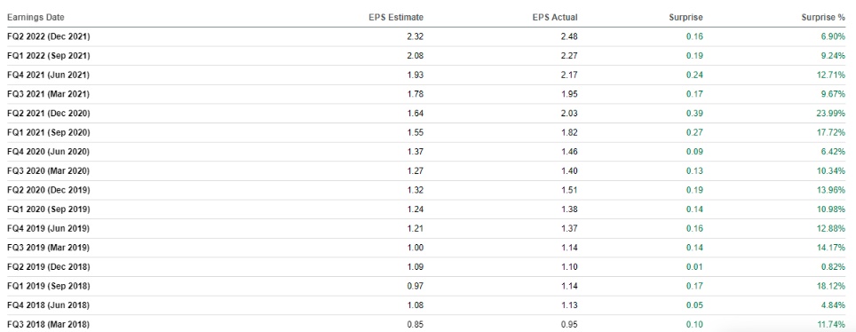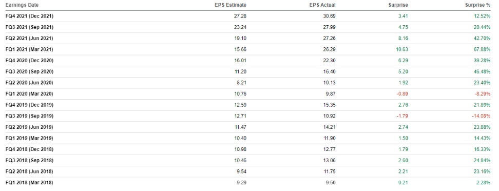 微软也将在美东时间4月28日盘后左右公布业绩。和苹果一样,微软也有超过分析师预期的强劲历史业绩: