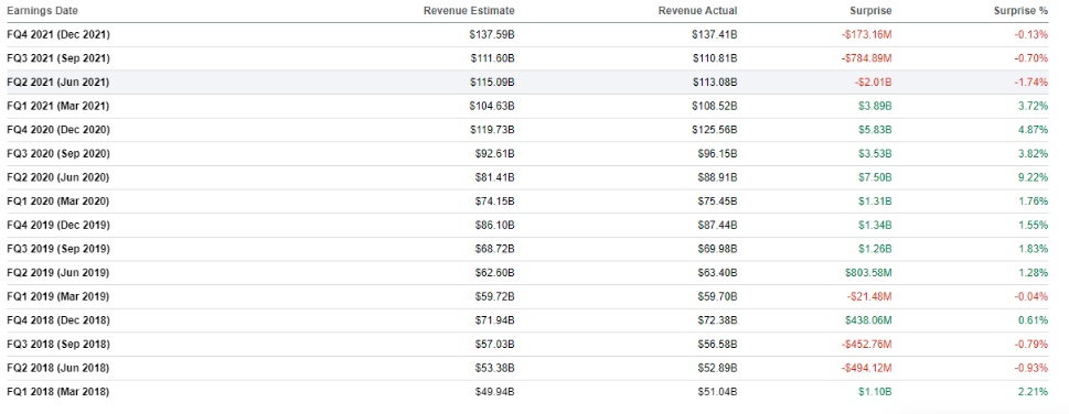 虽然市场相信苹果和微软都是优秀的长期投资者,但投资者对亚马逊不太有信心。该公司盈利惊喜的历史喜忧参半,但更能说明问题的是,亚马逊的营收惊喜已经连续三个季度下降。