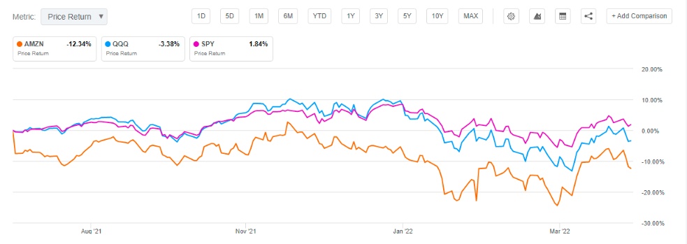 自亚马逊于2021年7月29日公布2021年第二季度业绩以来,其股价下跌了12.34%,相比之下,同期景顺QQQ ETF的股价下跌了3.38%,而SPDR 标普500信托 ETF的股价上涨了1.84%。