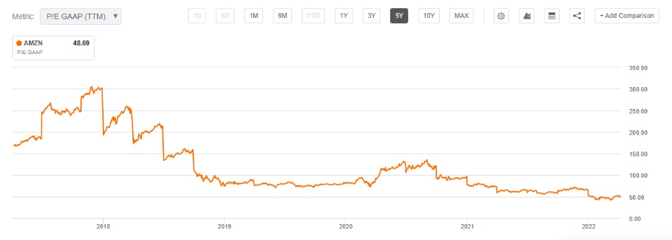 亚马逊的非公认会计准则下的历史市盈率和远期市盈率分别为48.71和64.95,近来一直在稳步下降。分析师预计亚马逊Q1营收为1,164.4亿美元,EPS为8.76美元,但值得注意的是,有19