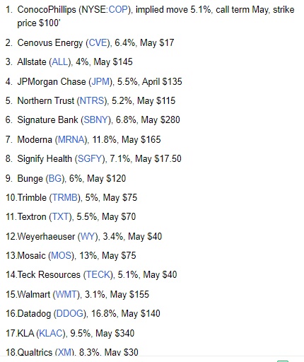 Marshall的团队参考了高盛股票分析师的最新预测数据和定性评论,找出了25个可能与当前财报季的市场普遍预期不符合(高于或者低于预期),并预计股价将出现波动的美股。其中,选择期权的月度到期日最接近于看涨期权或看跌期权的首个月到期日。