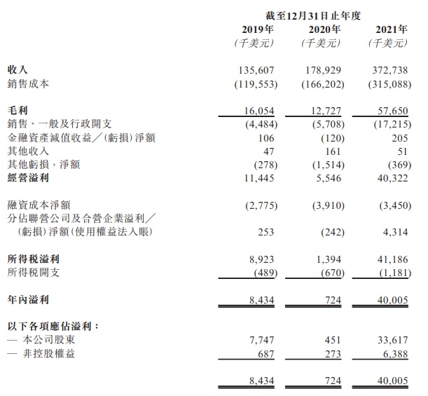 于往绩记录期间,公司获得显着增长。截至2019年、2020年及2021年12月31日止年度,公司的总收入分别约为1.356亿美元、1.789亿美元及3.727亿美元,相当于2019年至2020年增加约32.0%,以及2020年至2021年进一步增加约108.3%。