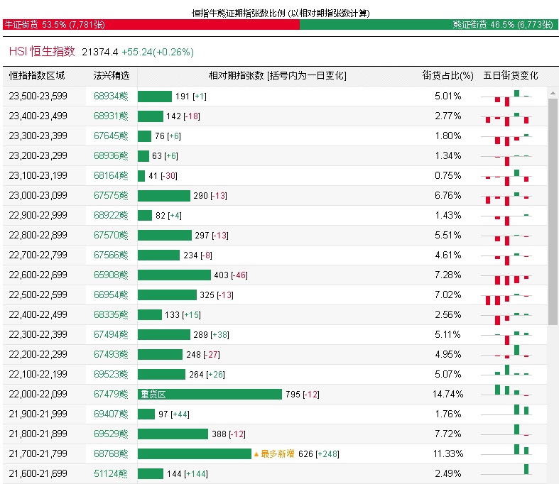 法兴恒指牛熊证街货分布图中的数据显示,熊证街货重货区在22000-22099区间,该区间最新熊证数量为795张,较上一交易日减少12张;最多新增在21700-21799区间,该区间最新熊证数量为626张,较上一交易日增加248张。