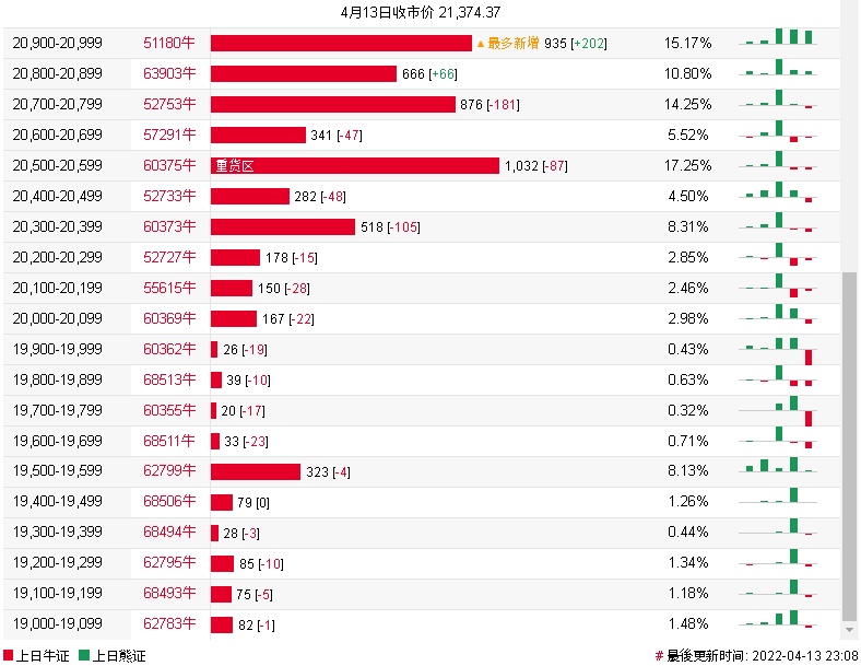 牛证街货重货区在20500-20599区间,该区间最新牛证数量为1032张,较上一交易日减少87张;最多新增在20900-20999区间,该区间最新牛证数量为935张,较上一交易日增加202张。