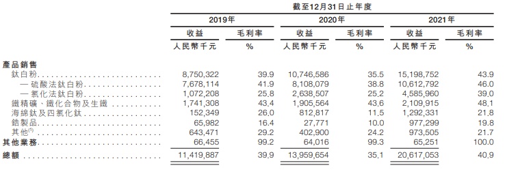 公司是全球钛白粉生产企业中的领导者。根据弗若斯特沙利文的资料,按产量、销量、销售收益及产能计,公司是2020年全球第三大及亚洲与中国最大的钛白粉生产商。截至2020年12月31日止年度,按产量计,公司占全球市场份额的11.4%以及中国市场份额的23.4%,按销量计,占全球市场份额11.7%以及中国市场份额的24.0%,按销售收益计,占全球市场份额10.3%以及中国市场份额的 26.5%。截至2020年12月31日,公司按产能计占全球市场的11.7%及亚洲市场份额的20.9%,公司在亚洲的市场份额远超亚洲第二大生产商(市场份额为8.3%)以及亚洲其他竞争者。公司的钛白粉产品主要用作生产涂料、塑料、造纸及油墨等的塬料。
