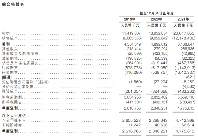 于2019年、2020年及2021年,龙佰集团收入分别为约114.20亿、139.60亿、206.17亿元人民币。同期,年内溢利分别为约26.17亿、23.40亿、47.76亿元人民币。
