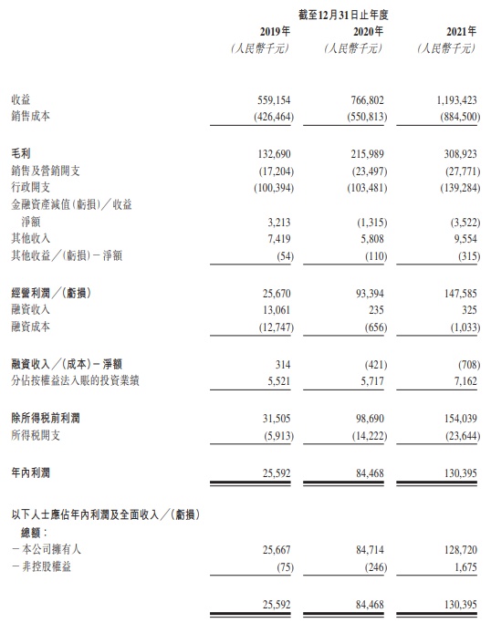 公司2019年、2020年及2021年度的收益分别为约5.592亿元(人民币,下同)、7.668亿元、11.934亿元。同期,毛利分别约为1.327亿元、2.16亿元及3.089亿元;年内利润分别约为0.256亿元、0.845亿元、1.304亿元。