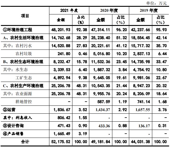 逐项来看,2019-2021年期间,艾布鲁的农村生活环境治理分别实现收入1.86亿元、2.52亿元、1.48亿元,占比为42.14%、51.32%、28.29%;农村生态环境治理收入分别为1.47亿元、1.15亿元、8232.47万元,占比为33.47%、23.45%、15.78%;农产生产环境治理收入为8947.23万元、1.05亿元、2.52亿元,占比为20.32%、21.44%、48.31%。