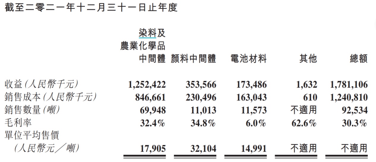 据财报显示,彩客化学2021年的总收入为17.81亿人民币,同比增长39.7%,已接近疫情发生前2019年的营收水平。详细来看,染料及农业化学品中间体的收入为12.52亿元,同比增长24.58%,这主要得益于产品总销量增长12.3%以及单位平均售价增长10.9%;占总收入的比例下降8个百分点至70.3%。颜料中间体的收入为3.54亿元,同比增长约39.2%,这主要是因为该产品销量增长26.66%以及单位平均售价增长9.87%。