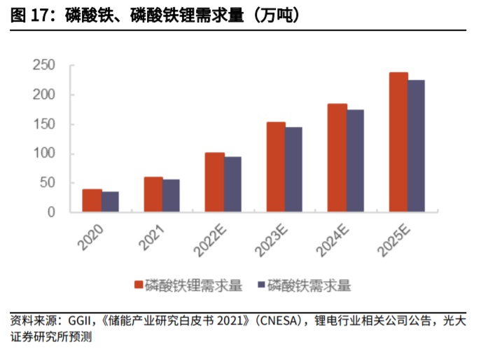 据则言咨询的数据显示,2021年我国的磷酸铁材料产量为33.36万吨,同比增长164.7%。光大证券表示,得益于下游需求的持续快速增长,国内磷酸铁的需求量有望在2025年增至225.35万吨,四年复合增速高达60%。