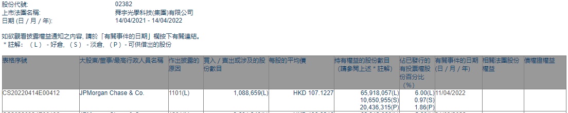 智通财经APP获悉,香港联交所最新资料显示,4月11日,小摩增持舜宇光学(02382)108.8659万股,每股作价107.1227港元,总金额约为1.17亿港元。增持后最新持股数目约为6591.81万股,最新持股比例为6.00%。