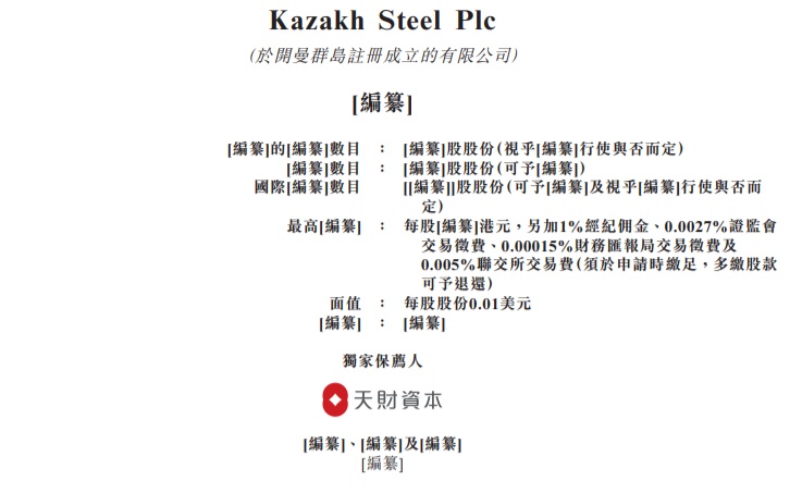 智通财经APP获悉,据港交所4月14日披露,哈萨克斯坦矿业公司Kazakh Steel Plc向港交所提交上市申请书,天财资本为其独家保荐人。