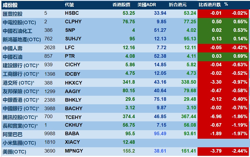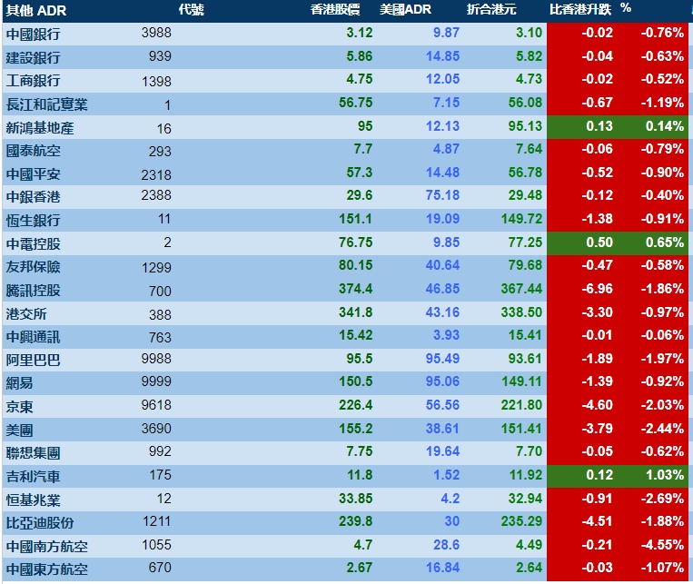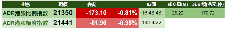 智通财经APP获悉,周四美股三大指数悉数下跌,港股ADR指数下跌,按比例计算,收报21350点,较香港收市跌173.10点或0.81%。