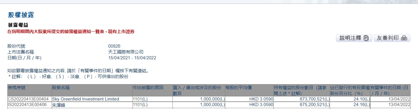 智通财经APP获悉,香港联交所最新资料显示,4月13日,行政总裁朱泽峰增持天工国际(00826)100万股,每股作价3.059港元,总金额约为305.9万港元。增持后最新持股数目约为6.75亿股,最新持股比例为24.16%。