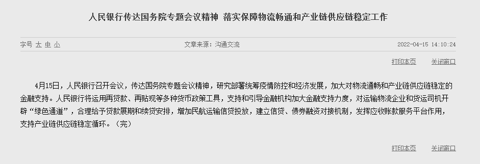智通财经APP获悉,据央行4月15日消息,人民银行召开会议,传达国务院专题会议精神,研究部署统筹疫情防控和经济发展,加大对物流通畅和产业链供应链稳定的金融支持。人民银行将运用再贷款、再贴现等多种货币政策工具,支持和引导金融机构加大金融支持力度,对运输物流企业和货运司机开辟“绿色通道”,合理给予贷款展期和续贷安排,增加民航运输信贷投放,建立信贷、债券融资对接机制,发挥应收账款服务平台作用,支持产业链供应链稳定循环。