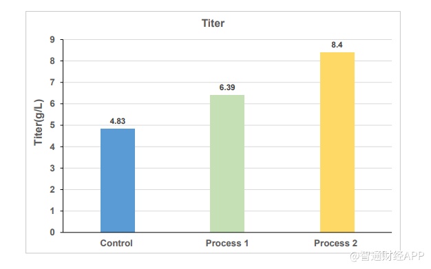 除了细胞生长方面的比较外,奥浦迈还进行了定制项目的产品应用对比。数据显示对照组的抗体表达量不及 5 g/L,而发行人 Process2 工艺的抗体表达量达到 8.4g/L,是对照组的 1.74 倍。而这一数据对比,能切实证明,奥浦迈培养基产品和工艺优化培养基和工艺能够提升客户项目细胞培养的产量和质量,产品性能能够和对应进口品牌相媲美。