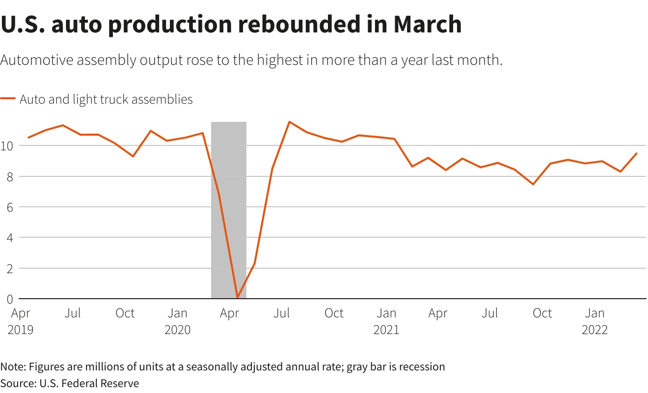 但美国汽车和零部件产量在2月份下修4.6%后,上月猛增7.8%,为去年10月以来的最大增幅。经季节性因素调整后,轿车和轻型卡车的总装配量同比增长至近950万辆,高于前一个月的830万辆,为2021年1月以来的最高水平。
