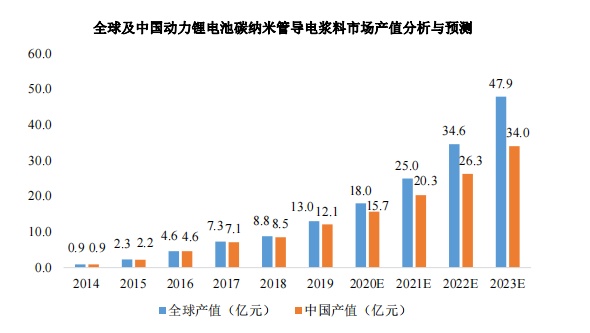 而从产值来看,动力锂电池用碳纳米管导电浆料的市场容量不断扩大。全球市场方面,预计到2023年,全球动力锂电池用碳纳米管导电浆料市场产值将逾47.9亿元,2020-2023年年均复合增长率达38.55%。国内市场方面,预计到2023年,国内动力锂电池用碳纳米管导电浆料市场产值将达到34亿元。