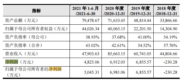 2018年至2021年上半年(以下简称:报告期内),公司的营业收入分别为4.48亿元(单位:人民币,下同)、6.07亿元、8.57亿元和4.79亿元,2018年至2020年复合增长率为38.27%。与此同时,归属于母公司净利润分别为-230.28万元、6855.57万元、6981.06万元、5045.31万元。无论是营收还是归母净利润,都呈快速增长趋势。
