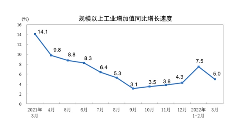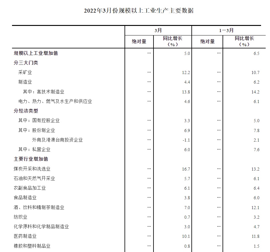 3月份,规模以上工业增加值同比实际增长5.0%(以下增加值增速均为扣除价格因素的实际增长率)。从环比看,3月份,规模以上工业增加值比上月增长0.39%。一季度,规模以上工业增加值同比增长6.5%。