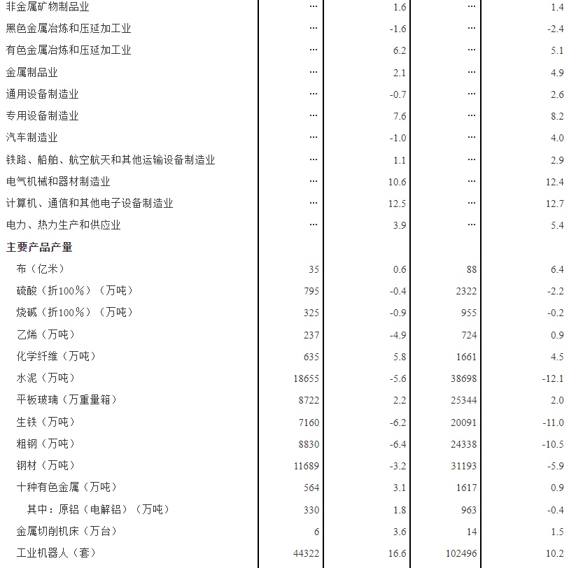 分行业看,3月份,41个大类行业中有37个行业增加值保持同比增长。其中,煤炭开采和洗选业增长16.7%,石油和天然气开采业增长5.7%,农副食品加工业增长6.1%,酒、饮料和精制茶制造业增长7.0%,纺织业增长0.7%,化学原料和化学制品制造业增长3.0%,非金属矿物制品业增长1.6%,黑色金属冶炼和压延加工业下降1.6%,有色金属冶炼和压延加工业增长6.2%,通用设备制造业下降0.7%,专用设备制造业增长7.6%,汽车制造业下降1.0%,铁路、船舶、航空航天和其他运输设备制造业增长1.1%,电气机械和器材制造业增长10.6%,计算机、通信和其他电子设备制造业增长12.5%,电力、热力生产和供应业增长3.9%。